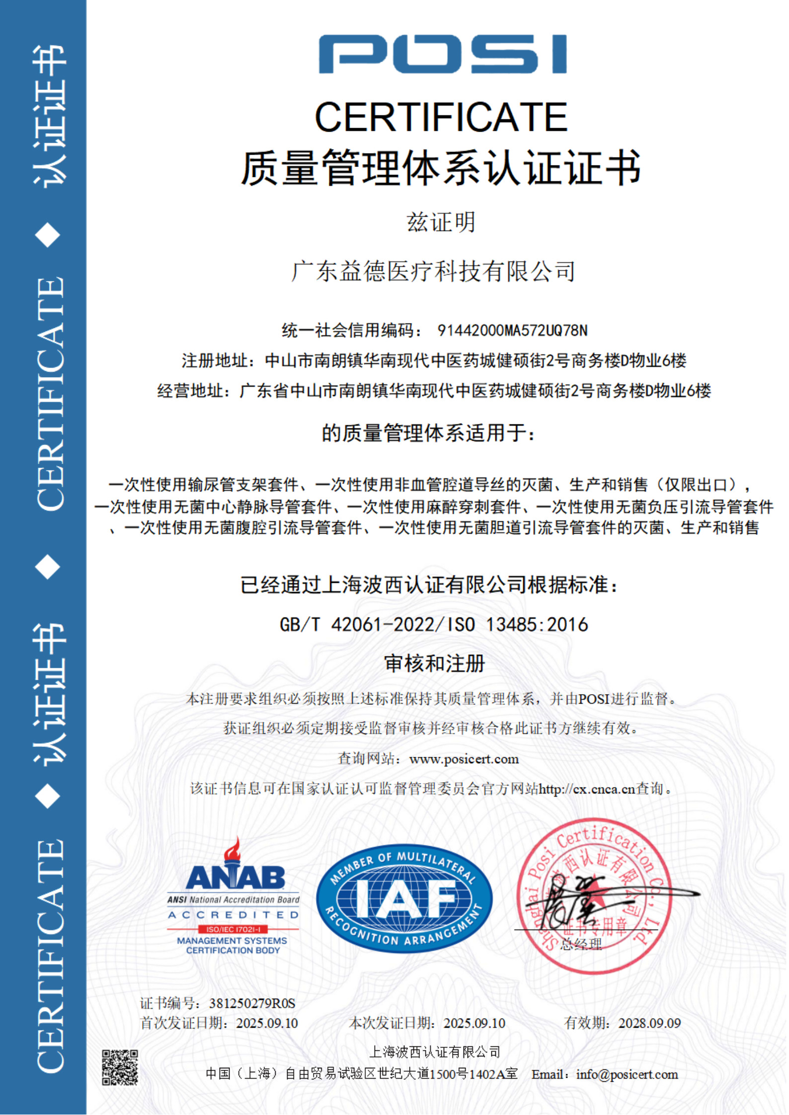 荣获ISO13485质量管理体系认证2025-09-11广东益德医疗于2025年9月成功通过ISO13485质量管理体系认证,该认证是进入国际医疗器械市场的通行证,标志着公司在质量管控、流程规范及风险等方便达到国际标准。